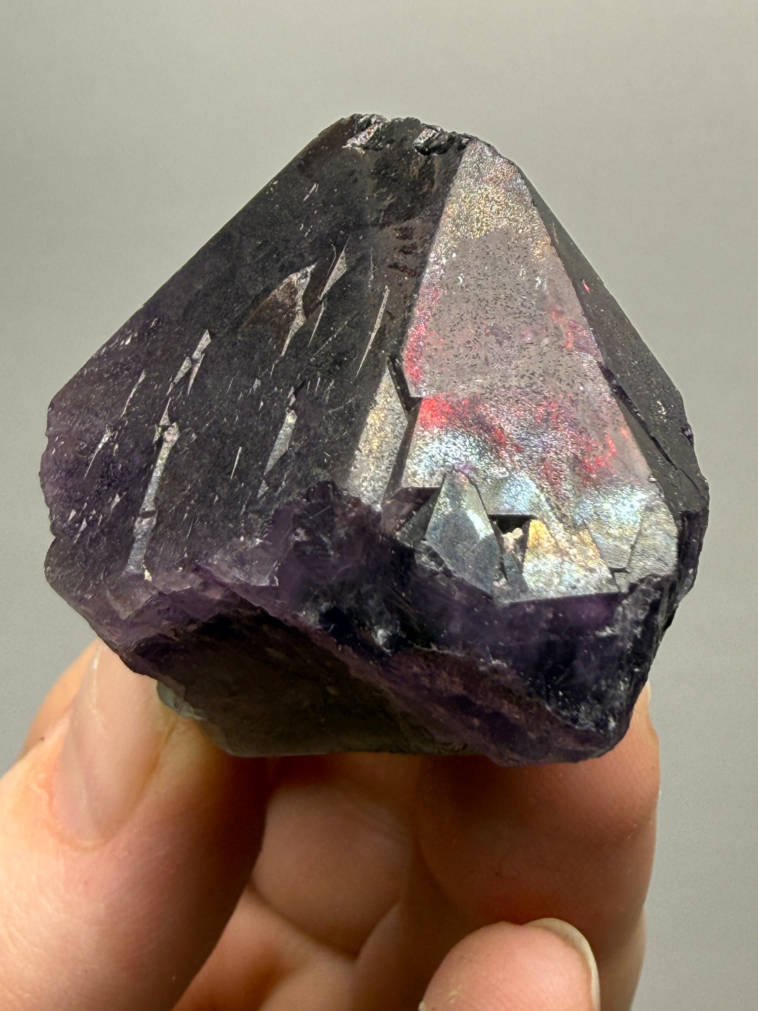 • Hematite inclusions formed from iron-rich fluids precipitating during crystal growth.