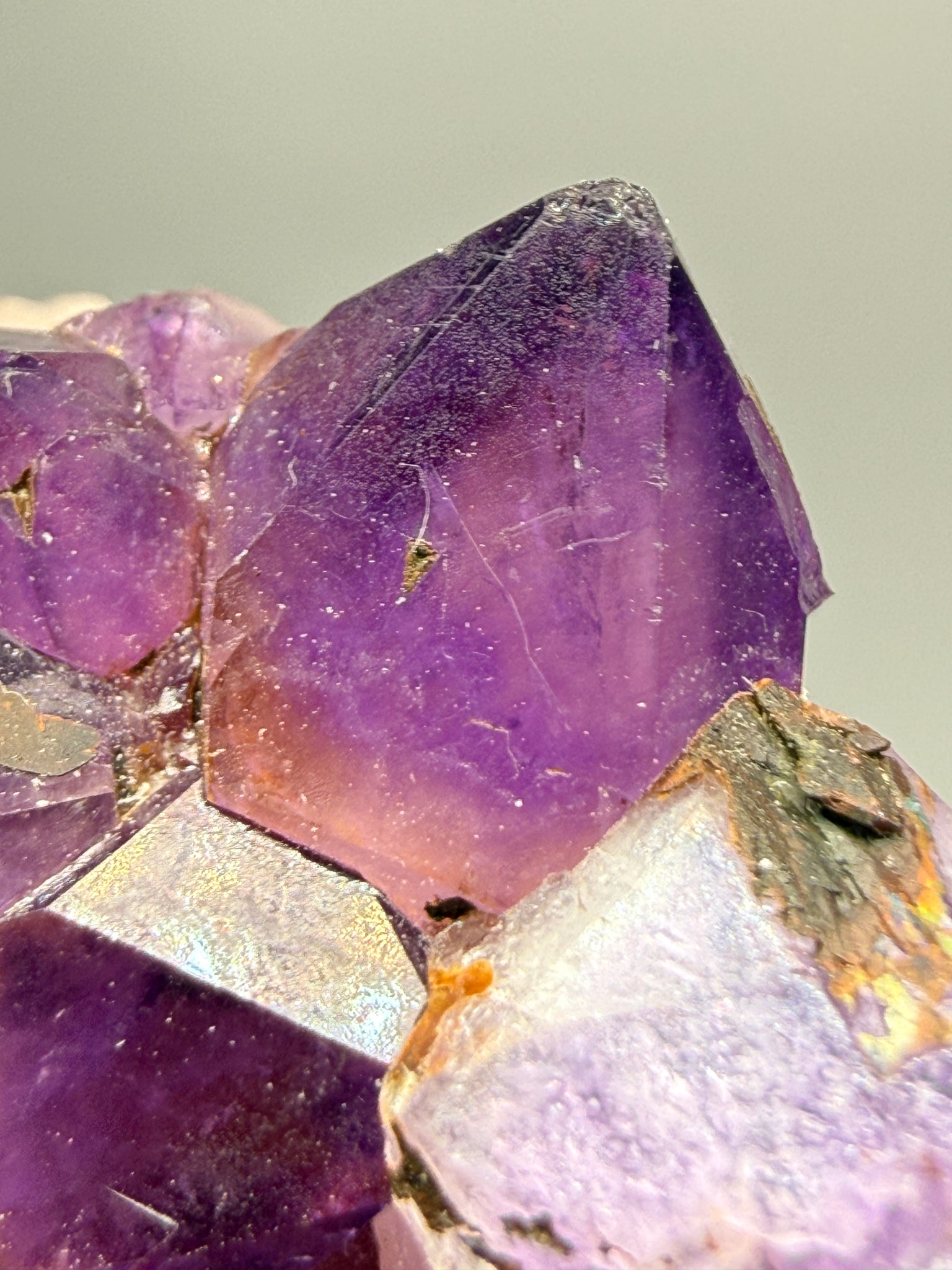 The crystal points display sharp, angular terminations with beautiful internal zoning visible under direct light. The hematite inclusions introduce rich internal shadows and flashes, giving the specimen dimensional complexity rarely seen in typical ametrine clusters.