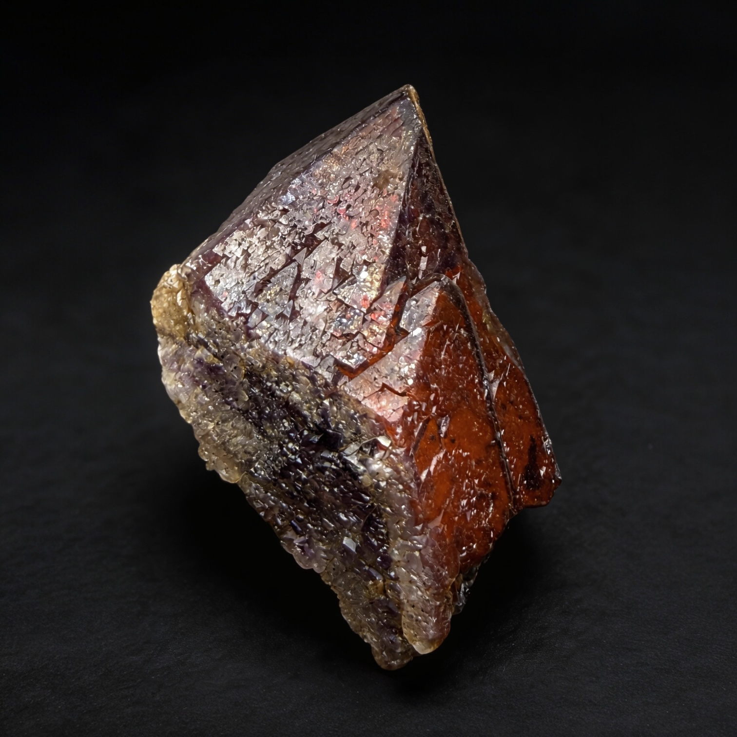 The crystal points display sharp, angular terminations with beautiful internal zoning visible under direct light. The hematite inclusions introduce rich internal shadows and flashes, giving the specimen dimensional complexity rarely seen in typical ametrine clusters.