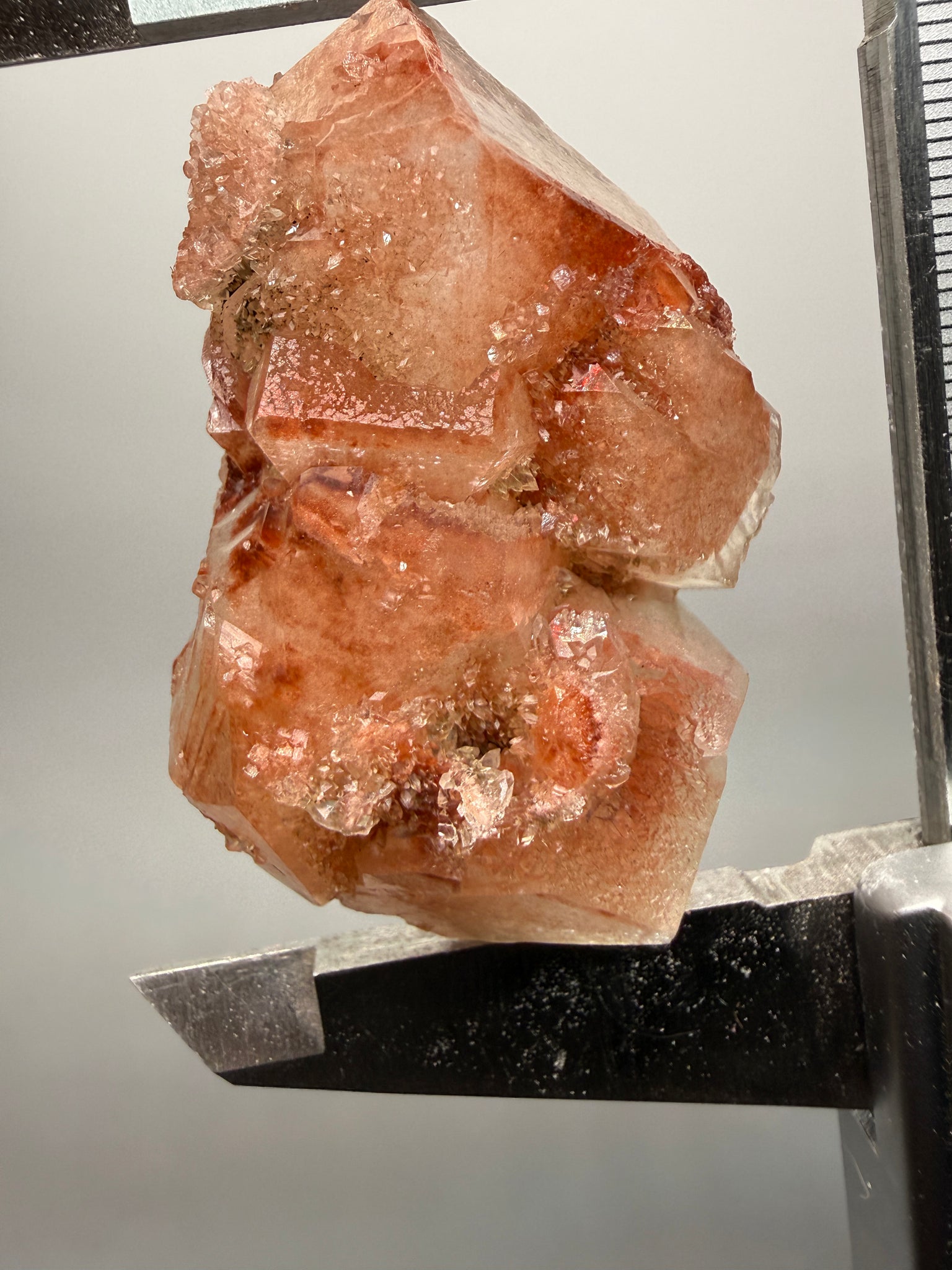 Red Apophyllite is far less common than the typical colorless or green varieties, making high-grade specimens like this especially sought after by serious collectors. The crystals exhibit excellent transparency to translucency, strong light reflection, and well-formed tetragonal geometry that sparkles dramatically under both natural and artificial light.