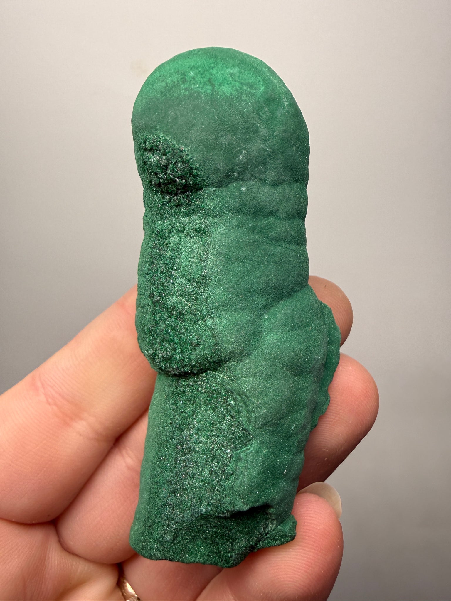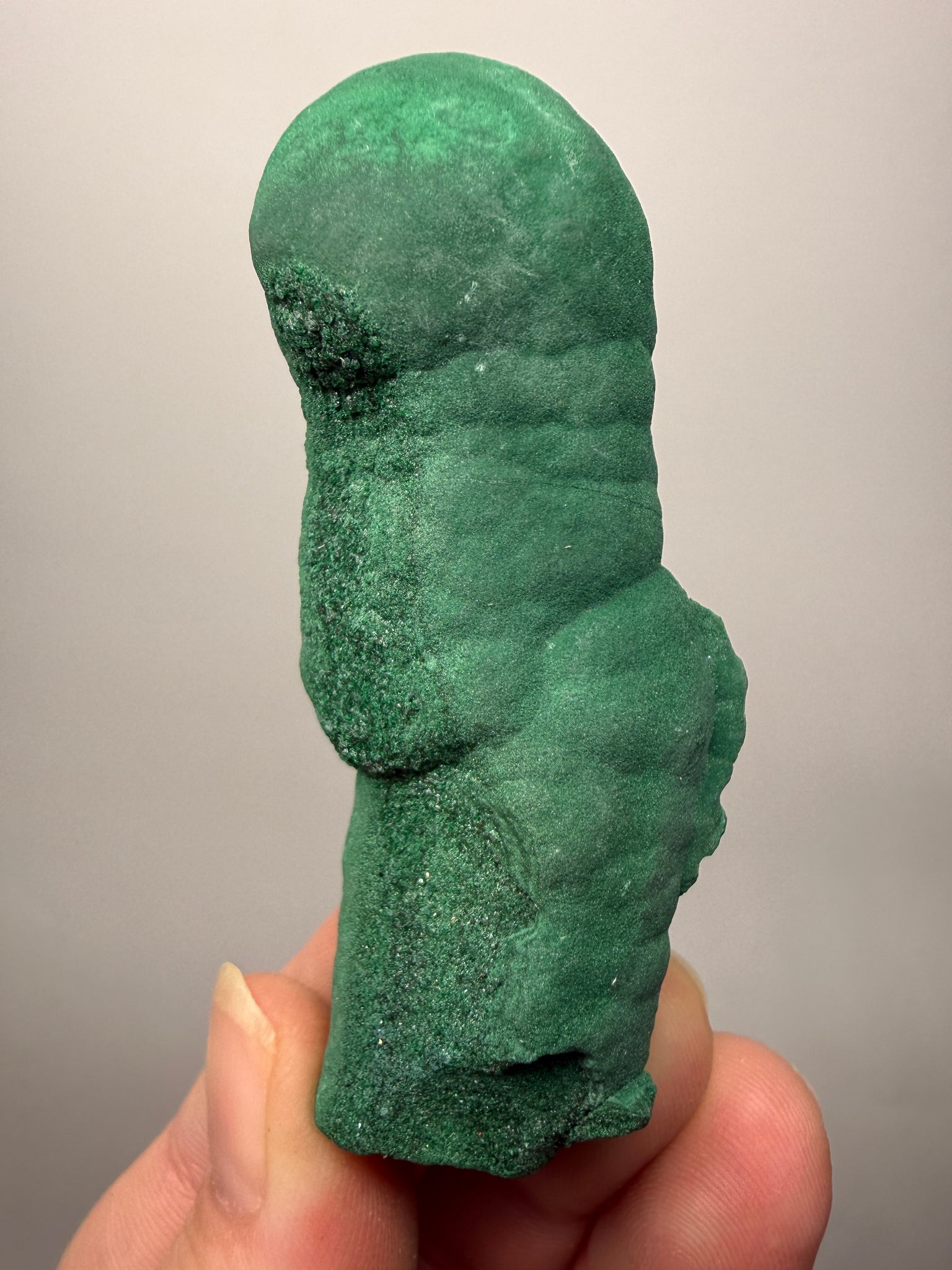 This authentic Malachite stalactite from the Democratic Republic of Congo is a show-stopping natural formation—built layer by layer as mineral-rich, copper-bearing solutions deposited malachite over time. The result is that iconic dripping stalactite structure with botryoidal (bubble-like) contours, velvety-to-satiny luster, and rich bands of green that feel straight out of an underground cave system.