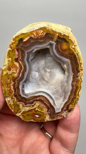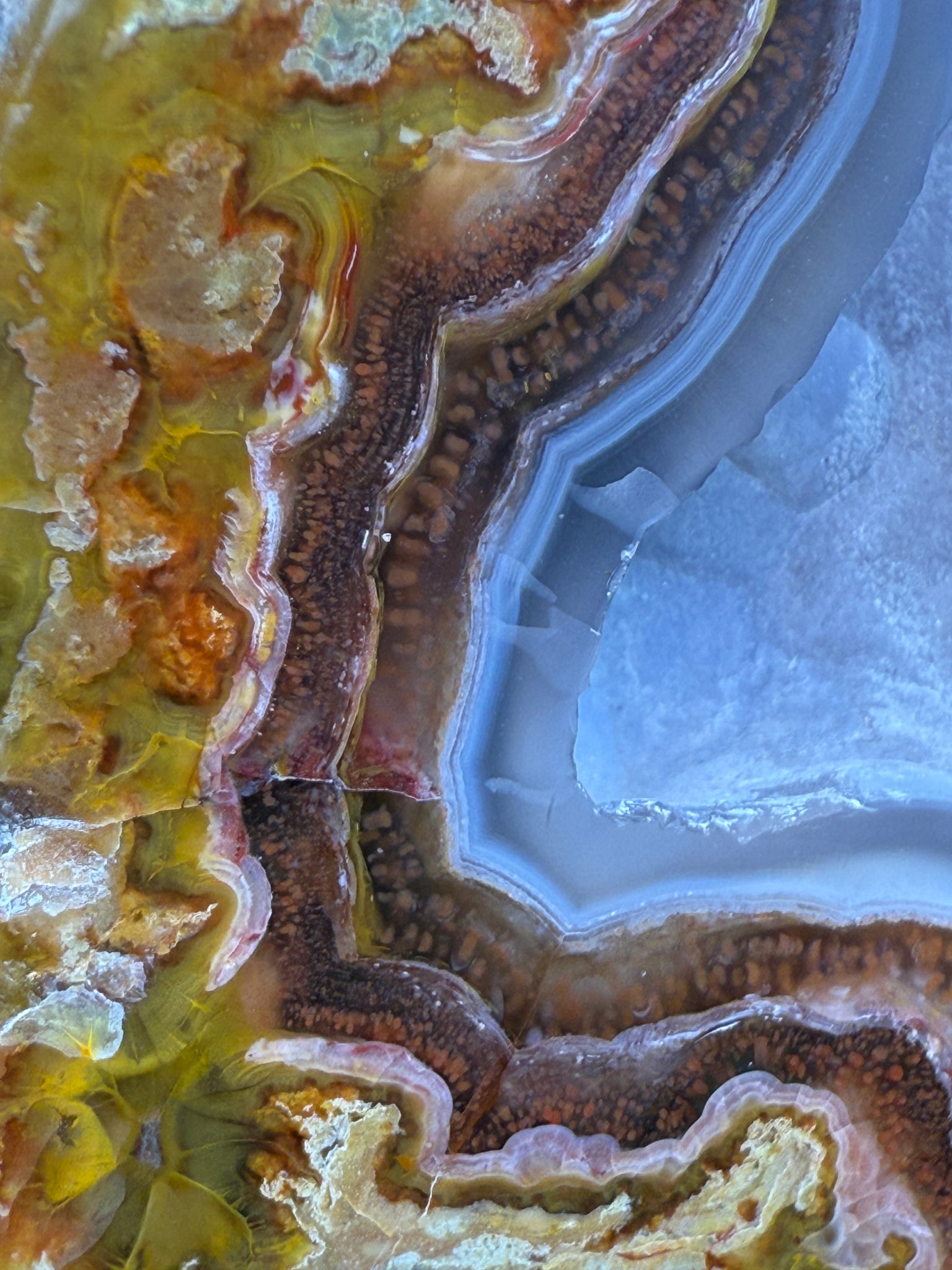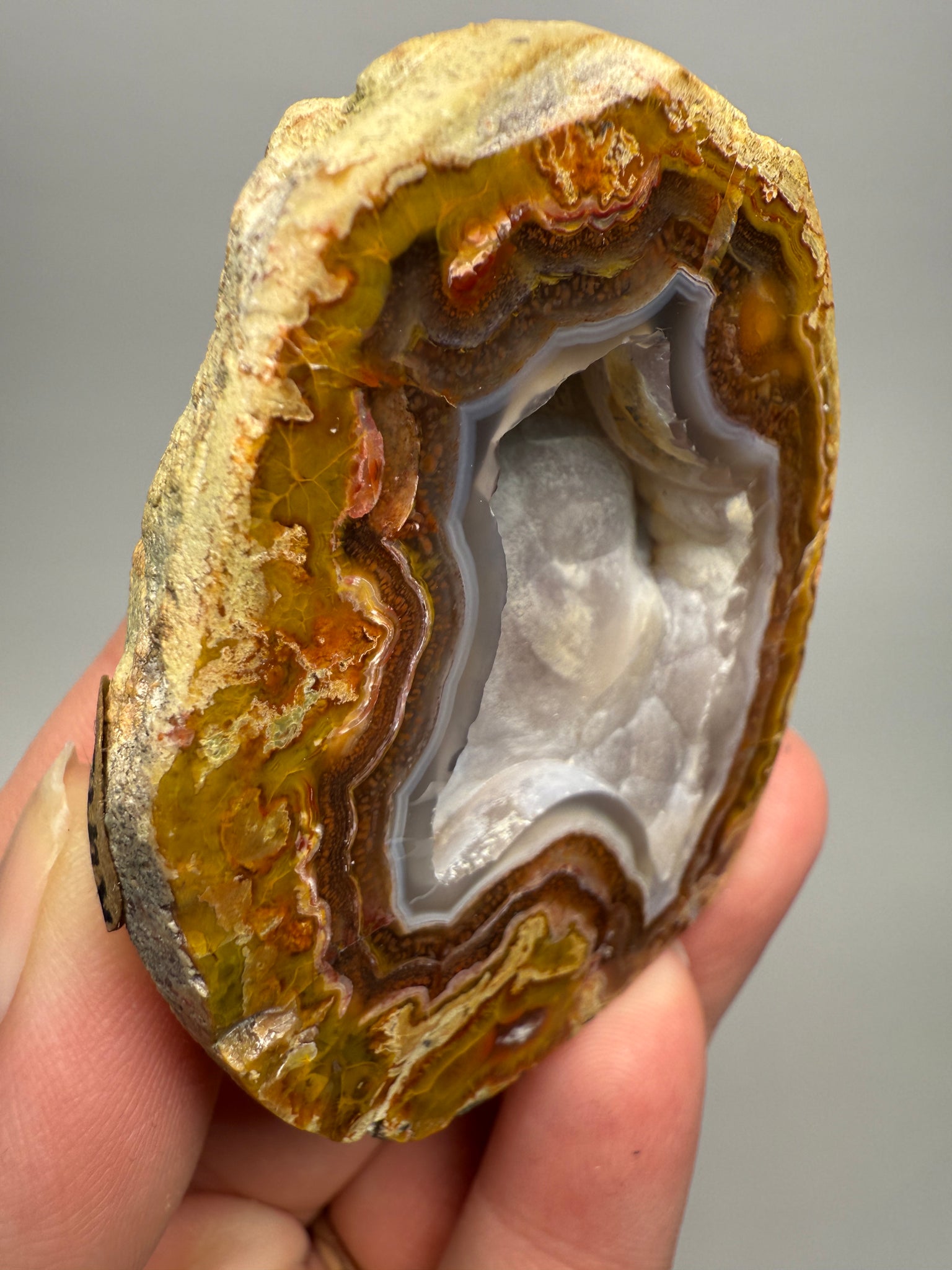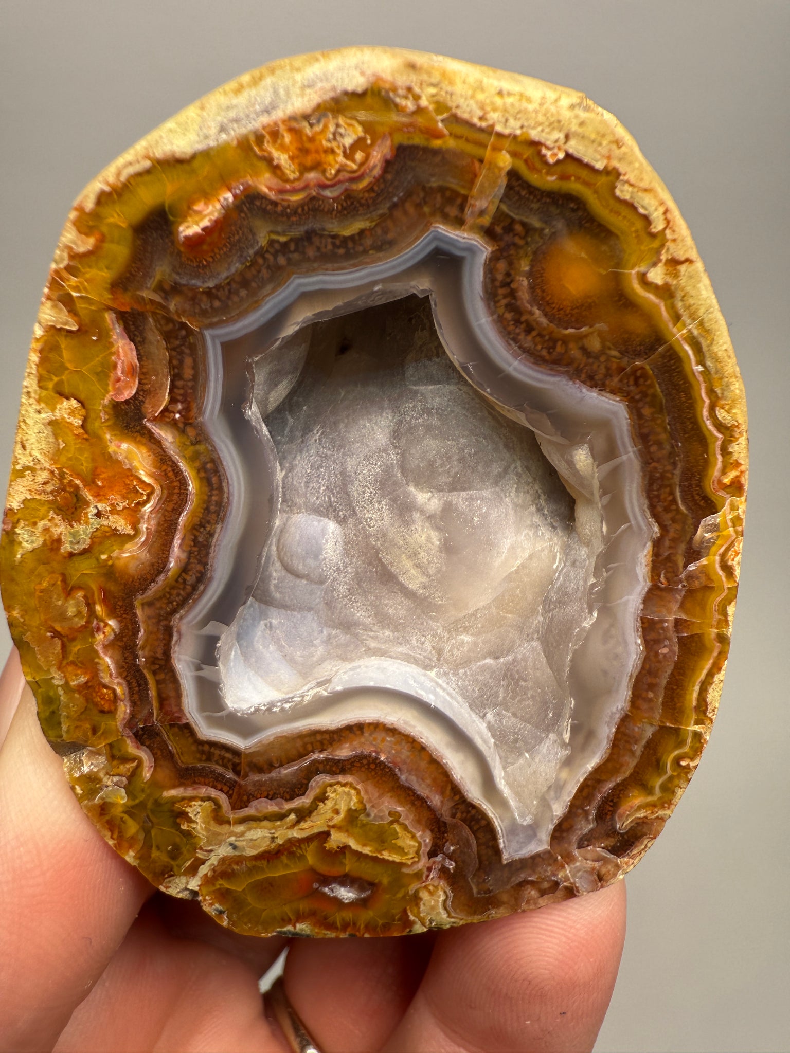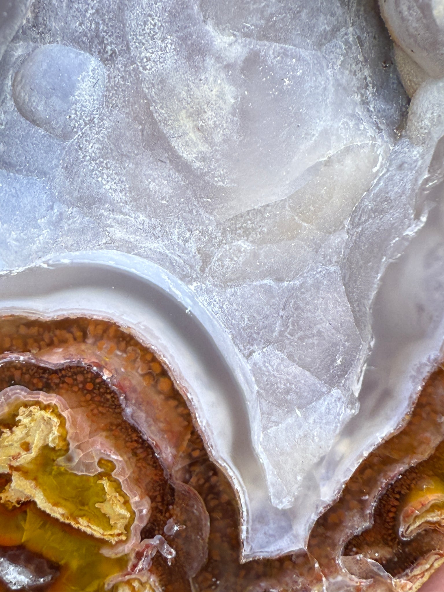 Mined from the ancient, volcanic-rich regions of Turkey, this high-grade Turkish Agate is a true geological marvel. Known for its vivid, natural banding and remarkable clarity, this piece features a stunning botryoidal chalcedony vug—a naturally formed pocket of microcrystalline quartz that appears in softly rounded, grape-like clusters. These unique formations add both visual and energetic dimension, making this agate a true showstopper.
